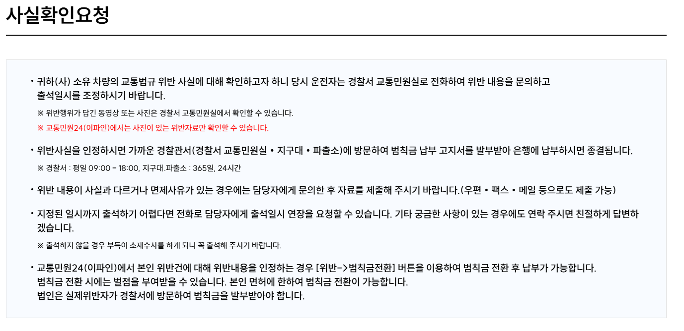 ● 이의신청 방법: 운전자가 사실관계를 다투거나 위반내용에 이의가 있는 경우, 이파인 내 민원신청 메뉴 혹은 관할 경찰서 교통민원 담당 부서를 통해 이의제기가 가능합니다. 다만 이의신청은 통지일로부터 일정 기간 내에 신청해야 한다는 조건이 있는 만큼 지체해서는 안 됩니다.